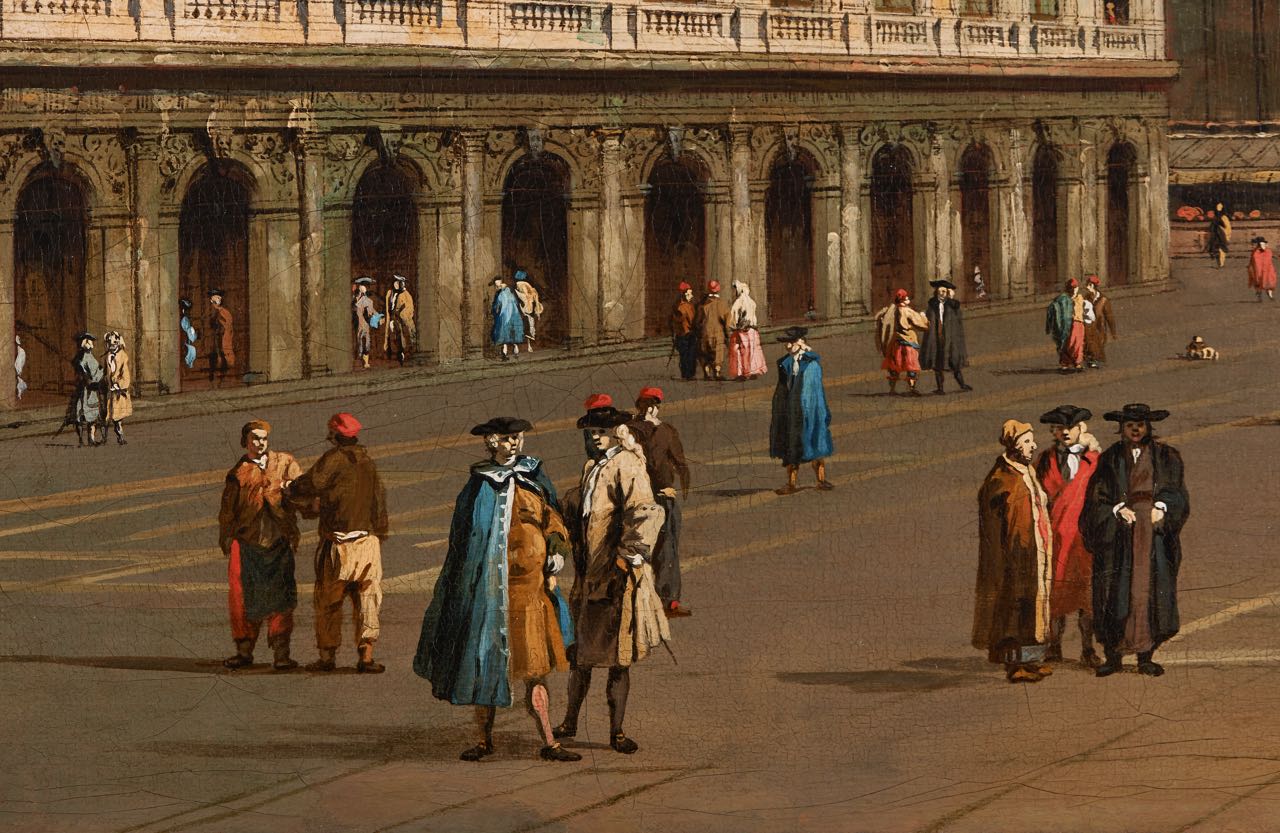 Il dipinto è una veduta della cosiddetta “piazzetta”, ossia l’area compresa tra Piazza San Marco e il lungomare. Il primo edificio a sinistra è la biblioteca, segue al centro il campanile di San Marco. Sullo sfondo la parte sud della facciata di San Marco con la torre dell’orologio (mancante dell’ultimo piano che sarà completato dal Massari nel 1755). Sulla destra chiude la veduta il Palazzo Ducale. La piazzetta è animata da gruppi di persone intente nella conversazione.