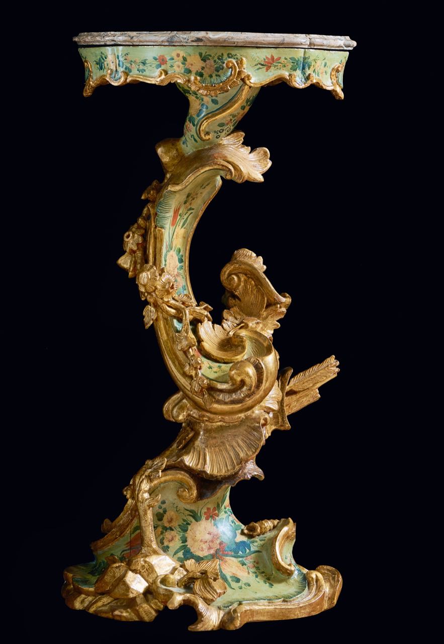 Il tavolino parietale è in legno laccato verde acqua, dipinto in policromia e dorato. Il piano è in marmo lumachella. Il mobiletto, ancora rococò, presenta una sola gamba a linee curve contrapposte che non mostrano alcun rispetto per la simmetria, cosa non frequente in tutta Italia. Queste curve si inerpicano e si contrappongono con forza, raggiungendo una delle più originali soluzioni formali fra tutti gli arredi europei del momento.