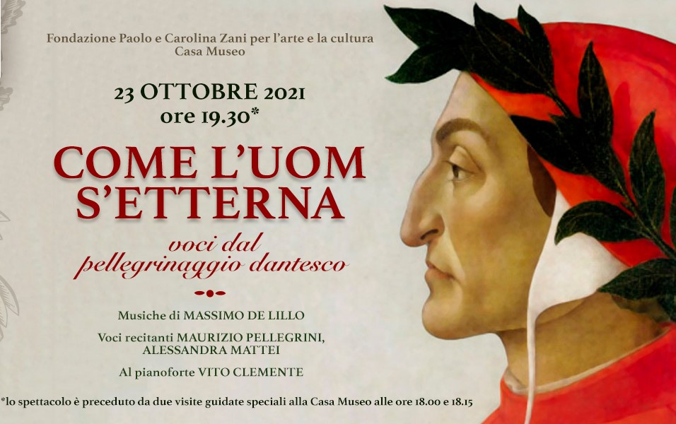 Seven voices from Hell to Heaven. Dante’s journey through the non-living voice of the most significant characters from Virgil to Beatrice, from Ulysses to San Bernardo. An original concert to experience the great poet firsthand, to try to make sense of our daily wild forest in a continuous game of allegorical and philosophical references enhanced by the original music of Massimo De Lillo and interpreted by Maurizio Pellegrini, Alessandra Mattei and Vito Clemente. The most famous journey in the world from the darkness of the sorrowful city to the love that moves the sun and other stars.