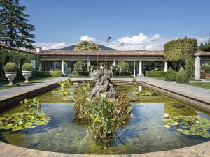 con tagli sferici. Fulcro della progettazione del versante occidentale del giardino è però certamente il ninfeo. La vasca di forma rettangolare ospita una selezione di ninfee, fiori di loto e carpe giapponesi (koi). Il ninfeo è animato anche dai giochi d’acqua di due fontane riconducibili al secondo quarto del XVIII secolo, raffiguranti una Coppia di putti con pesce e delfino mitologico e una Coppia di putti con cigno e vaso rovesciato.